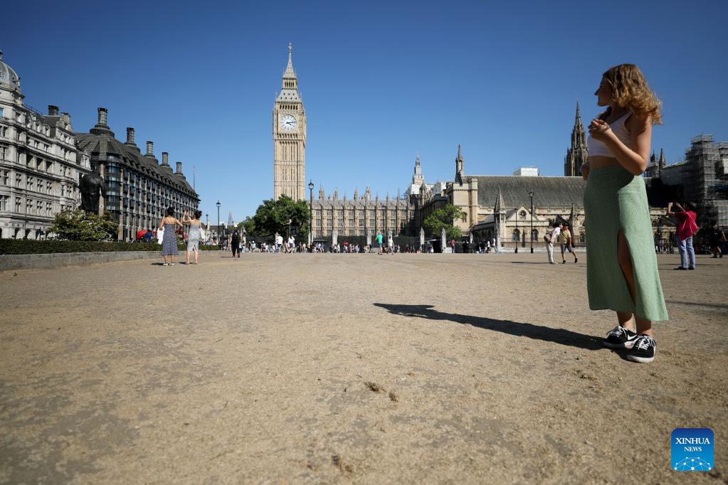 A woman stands on the lawn in Parliament Square in London, Britain, on Aug. 13, 2022. A drought was officially declared on Friday across a large swathe of England, amid a new heatwave and prolonged dry weather. (Xinhua/Li Ying)