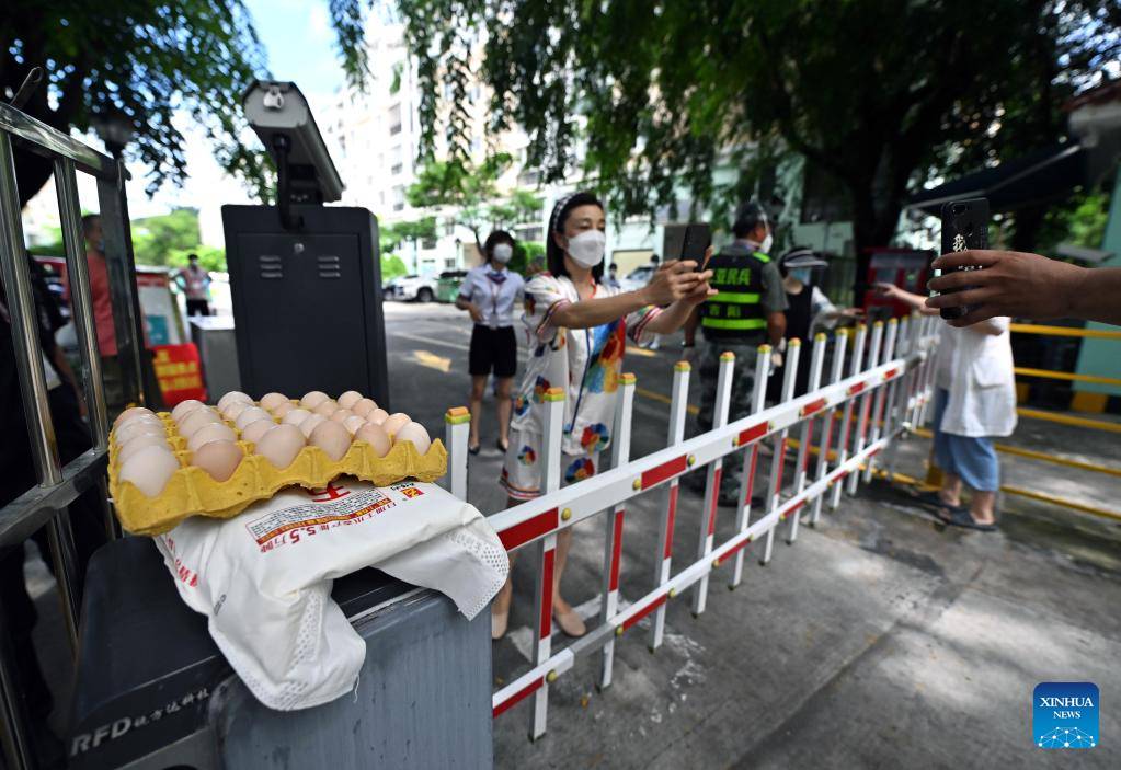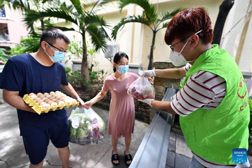 A volunteer (1st R) delivers daily life supplies at the entrance to a residential compound in Sanya, south China's Hainan Province, Aug. 13, 2022. The local government is exerting all efforts to ensure daily life supplies for local residents and stranded tourists in an effort to fight against the new resurgence of COVID-19 in the city. (Xinhua/Guo Cheng)