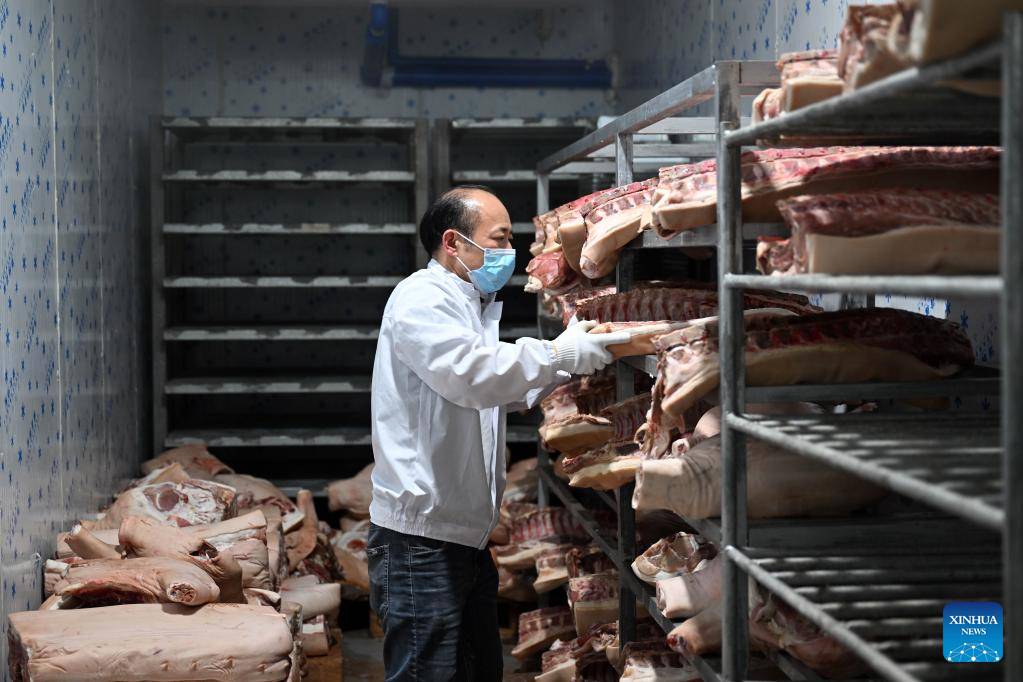 A staff member arranges frozen pork at a dispatch site of an on-line shopping service in Sanya, south China's Hainan Province, Aug. 13, 2022. The local government is exerting all efforts to ensure daily life supplies for local residents and stranded tourists in an effort to fight against the new resurgence of COVID-19 in the city. (Xinhua/Guo Cheng)