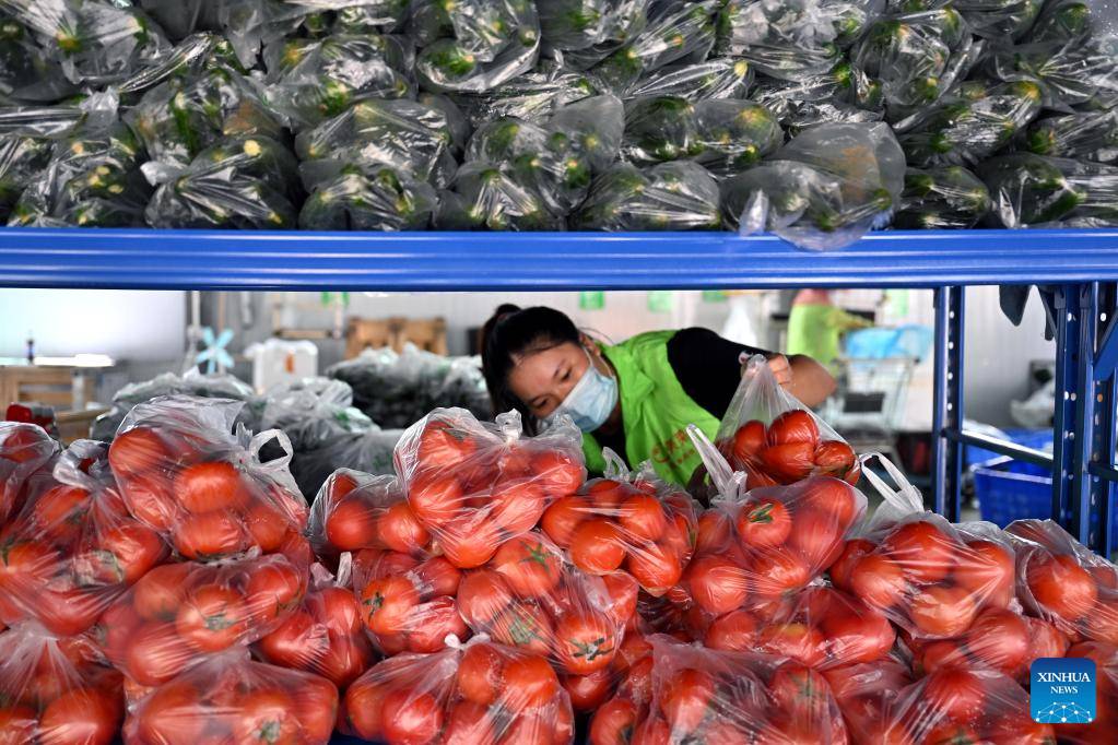A staff member arranges packed vegetables at a dispatch site of an on-line shopping service in Sanya, south China's Hainan Province, Aug. 13, 2022. The local government is exerting all efforts to ensure daily life supplies for local residents and stranded tourists in an effort to fight against the new resurgence of COVID-19 in the city. (Xinhua/Guo Cheng)