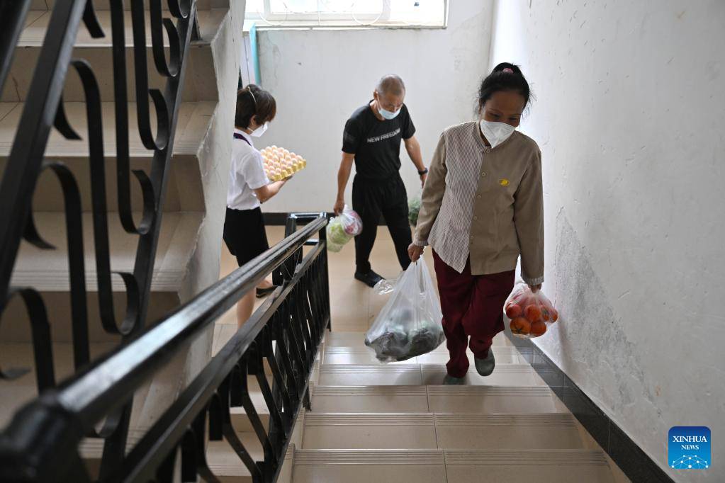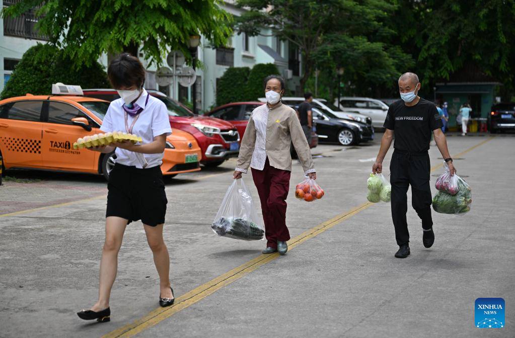 Staff members of the property management service (R and L) help a resident (C) move daily life supplies in a residential compound in Sanya, south China's Hainan Province, Aug. 13, 2022. The local government is exerting all efforts to ensure daily life supplies for local residents and stranded tourists in an effort to fight against the new resurgence of COVID-19 in the city. (Xinhua/Guo Cheng)
