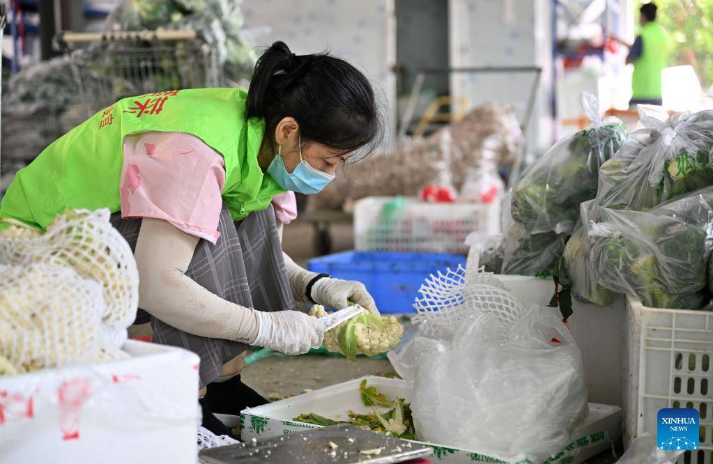 A staff member processes vegetables at a dispatch site of an on-line shopping service in Sanya, south China's Hainan Province, Aug. 13, 2022. The local government is exerting all efforts to ensure daily life supplies for local residents and stranded tourists in an effort to fight against the new resurgence of COVID-19 in the city. (Xinhua/Guo Cheng)