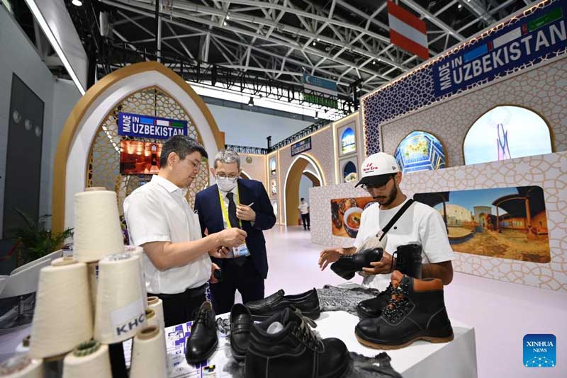 Visitors learn about specialties exhibited at the Uzbekistan booth during the sixth Silk Road International Exposition in Xi'an, northwest China's Shaanxi Province, Aug. 14, 2022.