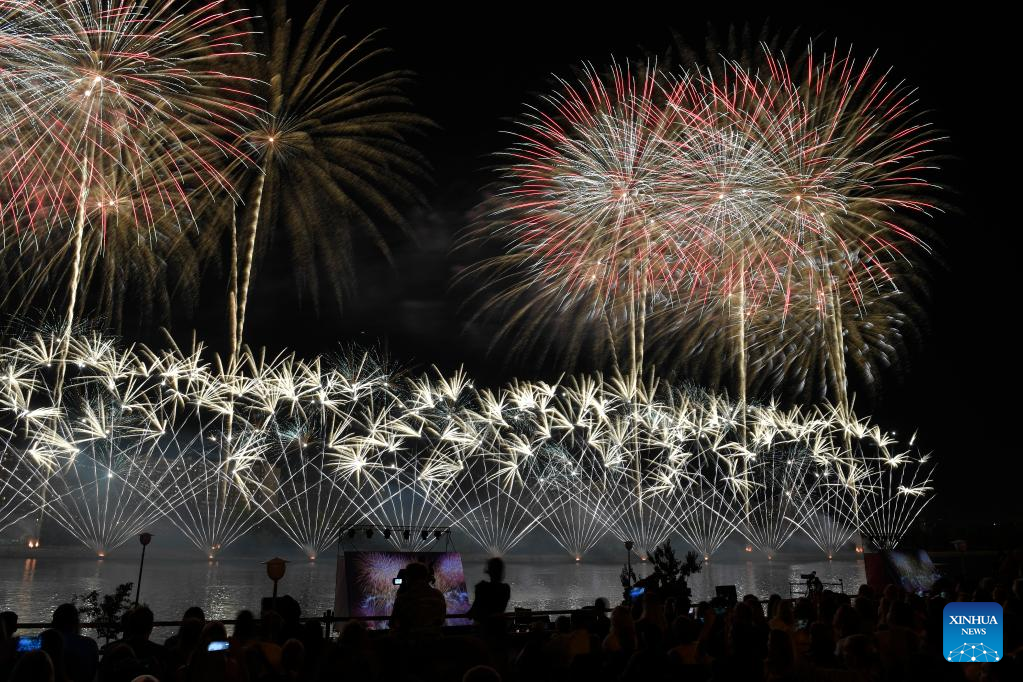 Fireworks explode in the sky during the Rostec fireworks festival in Moscow, Russia, Aug. 14, 2022. (Photo by Alexander Zemlianichenko Jr/Xinhua)