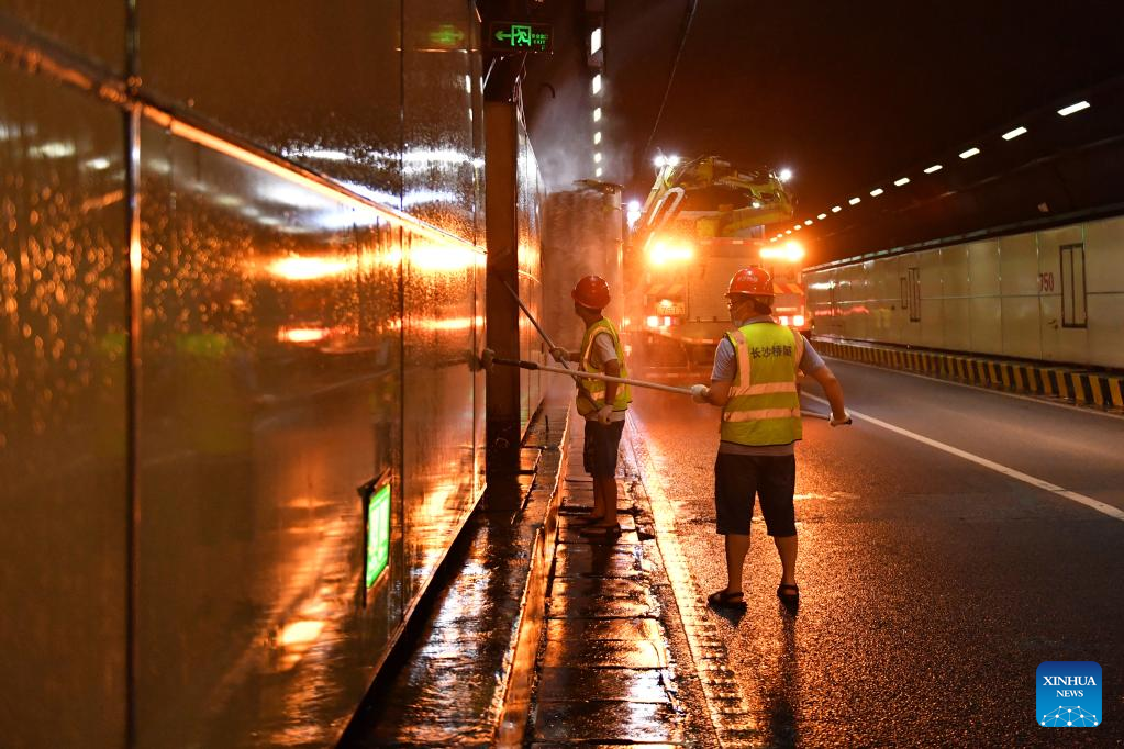 The 8.5-km-long Yingpan Road tunnel is the first tunnel across the Xiangjiang River. Workers carry out the routine maintenance of the tunnel from midnight to 6 a.m. every weekend to ensure safe travel for citizens. (Xinhua/Chen Zhenhai)