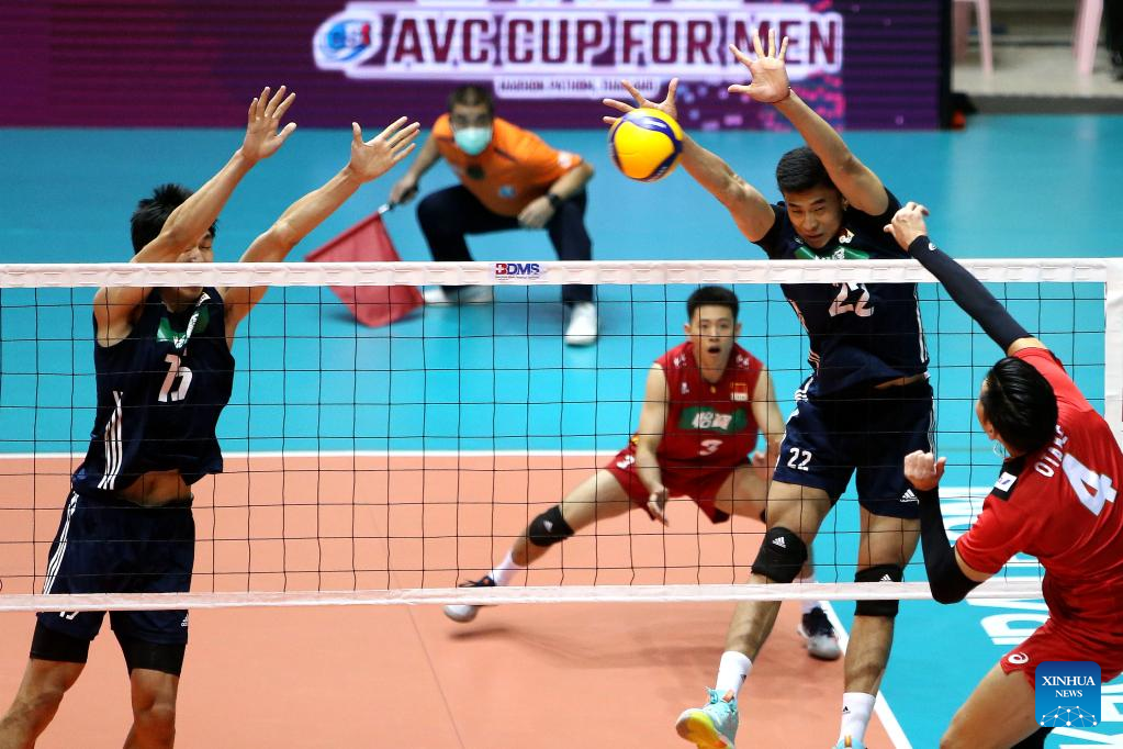 Zhang Jingyin (2nd R) of China blocks during the 2022 AVC (Asian Volleyball Confederation) Cup final between China and Japan in Nakhon Pathom, Thailand, Aug. 14, 2022. (Xinhua/Wang Teng)