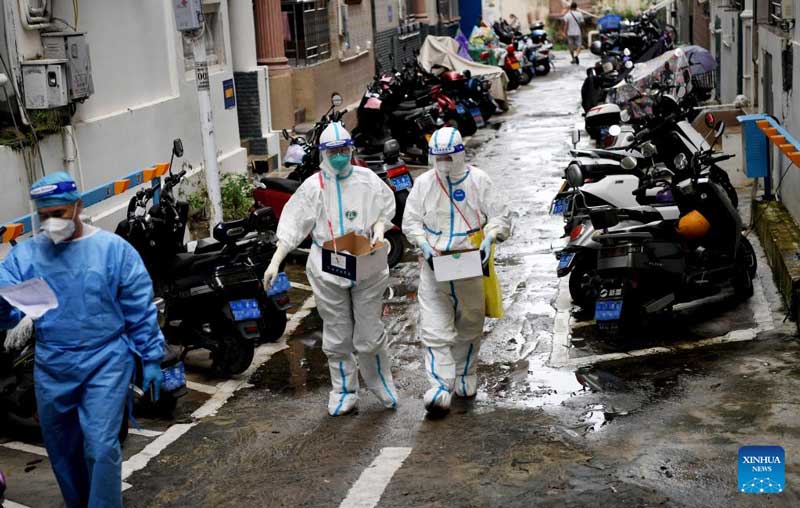 Medics from central China's Henan Province provide door-to-door sampling service for residents for nucleic acid testing in Sanya, south China's Hainan Province, Aug. 11, 2022. (Xinhua/Zhao Yingquan)