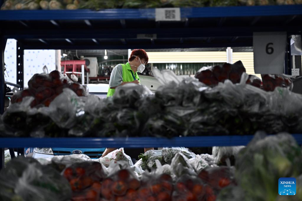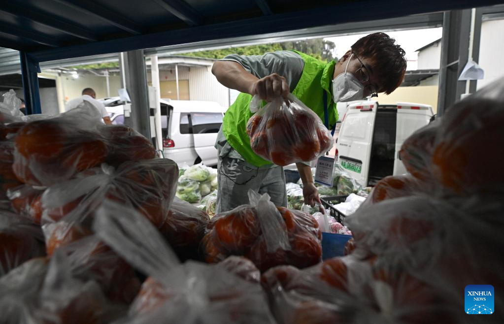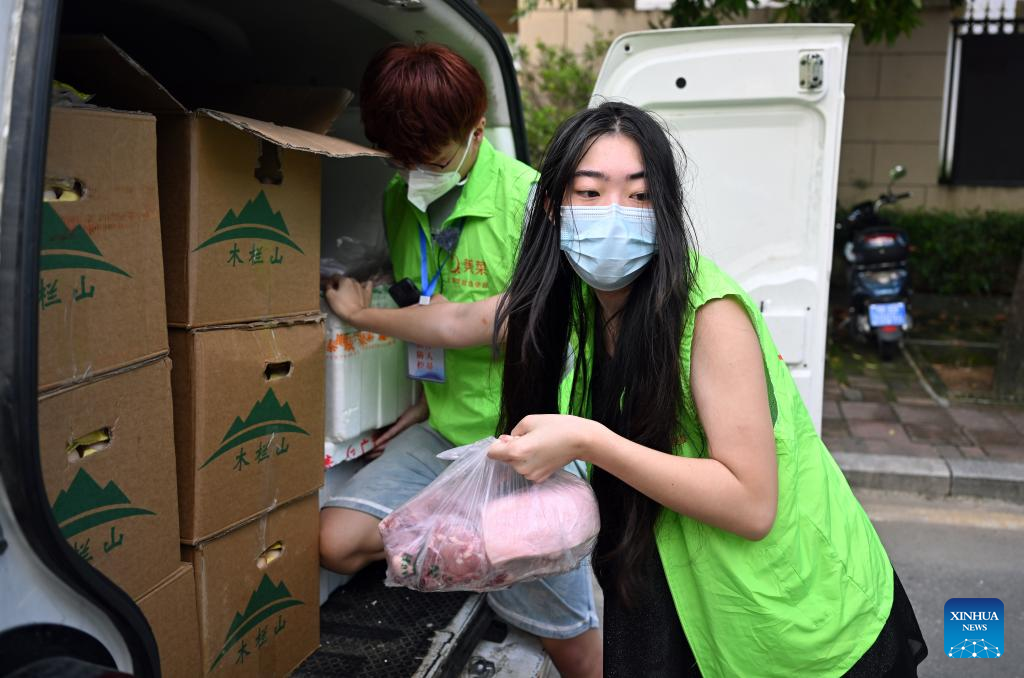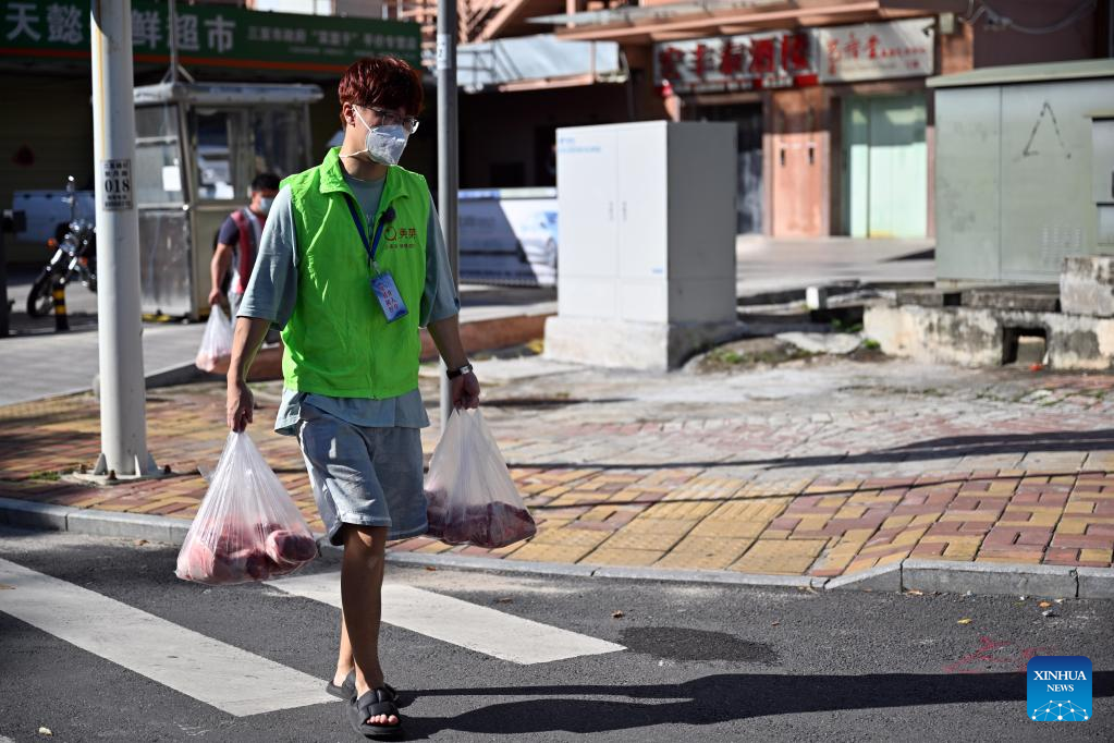 Zhang Haiyang delivers meat to residents in Sanya, south China's Hainan Province, Aug. 14, 2022. After the recent COVID-19 resurgence in Sanya, a coastal resort city, Zhang Haiyang, 22, a second-year graduate student, and his girlfriend Wu Fanli, 21, have joined a team of volunteers. They have driven a minivan to deliver daily supplies to local residents. Starting from 6 a.m. Zhang and Wu can deliver more than 100 orders per day. (Xinhua/Guo Cheng)