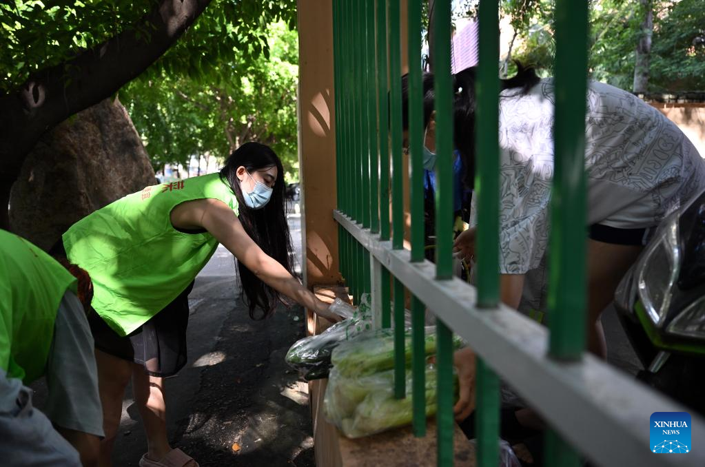Wu Fanli (2nd L) and Zhang Haiyang deliver daily supplies to residents in Sanya, south China's Hainan Province, Aug. 14, 2022. After the recent COVID-19 resurgence in Sanya, a coastal resort city, Zhang Haiyang, 22, a second-year graduate student, and his girlfriend Wu Fanli, 21, have joined a team of volunteers. They have driven a minivan to deliver daily supplies to local residents. Starting from 6 a.m. Zhang and Wu can deliver more than 100 orders per day. (Xinhua/Guo Cheng)