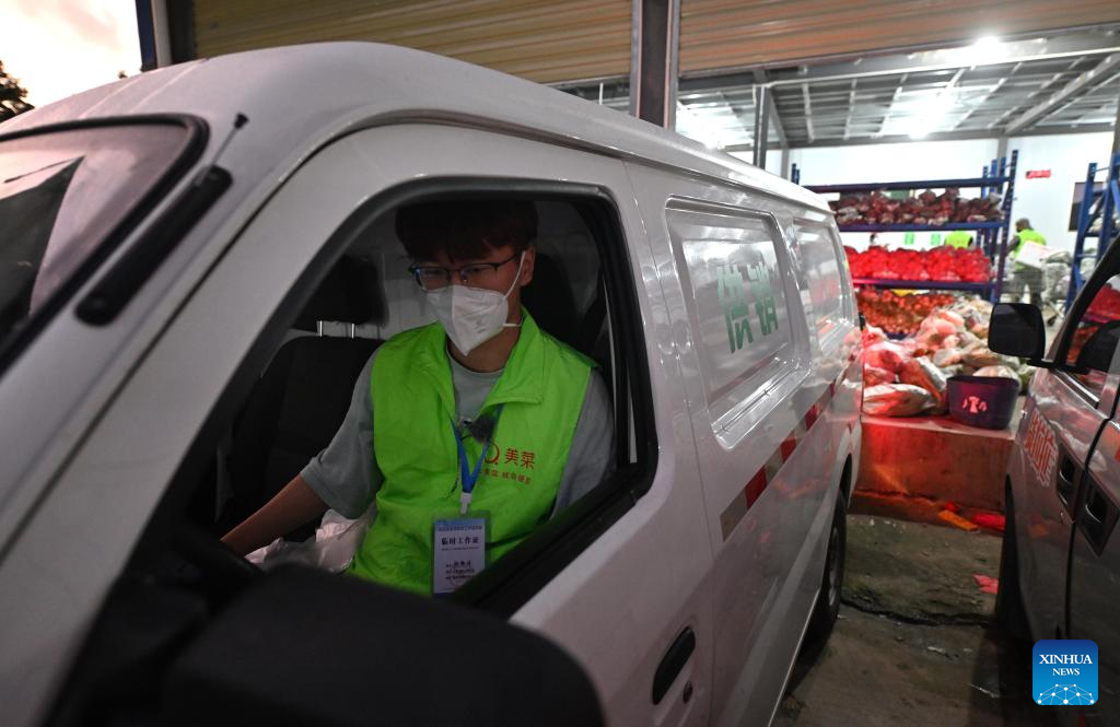 Zhang Haiyang arrives at a distribution center in Sanya, south China's Hainan Province, Aug. 14, 2022. After the recent COVID-19 resurgence in Sanya, a coastal resort city, Zhang Haiyang, 22, a second-year graduate student, and his girlfriend Wu Fanli, 21, have joined a team of volunteers. They have driven a minivan to deliver daily supplies to local residents. Starting from 6 a.m. Zhang and Wu can deliver more than 100 orders per day. (Xinhua/Guo Cheng)