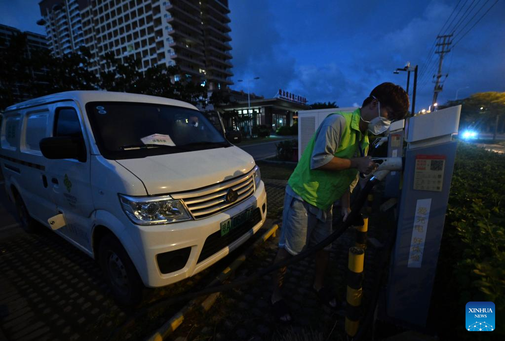 Zhang Haiyang gets a fully charged minivan to do delivery work in Sanya, south China's Hainan Province, Aug. 14, 2022. After the recent COVID-19 resurgence in Sanya, a coastal resort city, Zhang Haiyang, 22, a second-year graduate student, and his girlfriend Wu Fanli, 21, have joined a team of volunteers. They have driven a minivan to deliver daily supplies to local residents. Starting from 6 a.m. Zhang and Wu can deliver more than 100 orders per day. (Xinhua/Guo Cheng)