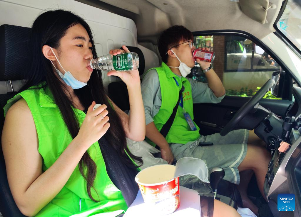 Zhang Haiyang (R) and Wu Fanli have lunch in a minivan in Sanya, south China's Hainan Province, Aug. 14, 2022. After the recent COVID-19 resurgence in Sanya, a coastal resort city, Zhang Haiyang, 22, a second-year graduate student, and his girlfriend Wu Fanli, 21, have joined a team of volunteers. They have driven a minivan to deliver daily supplies to local residents. Starting from 6 a.m. Zhang and Wu can deliver more than 100 orders per day. (Xinhua/Guo Cheng)