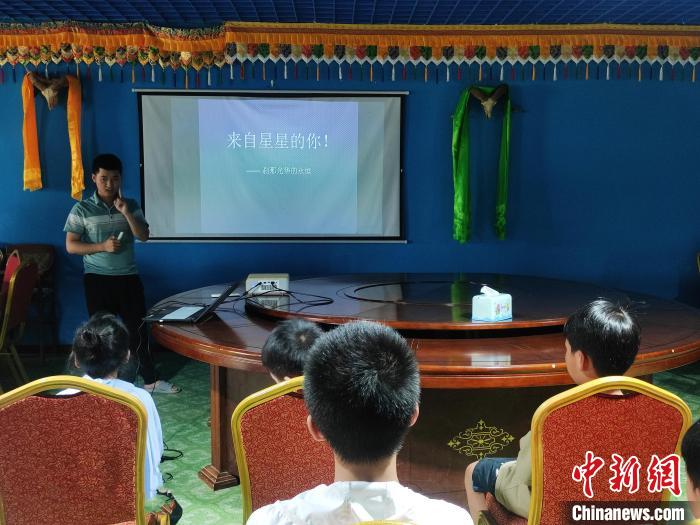 A lecturer presents information aimed at popularizing astronomical and scientific knowledge among the general public in the hinterland of the Tengger Desert in north China’s Inner Mongolia Autonomous Region. (Chinanews.com/Zeng Lingfei)