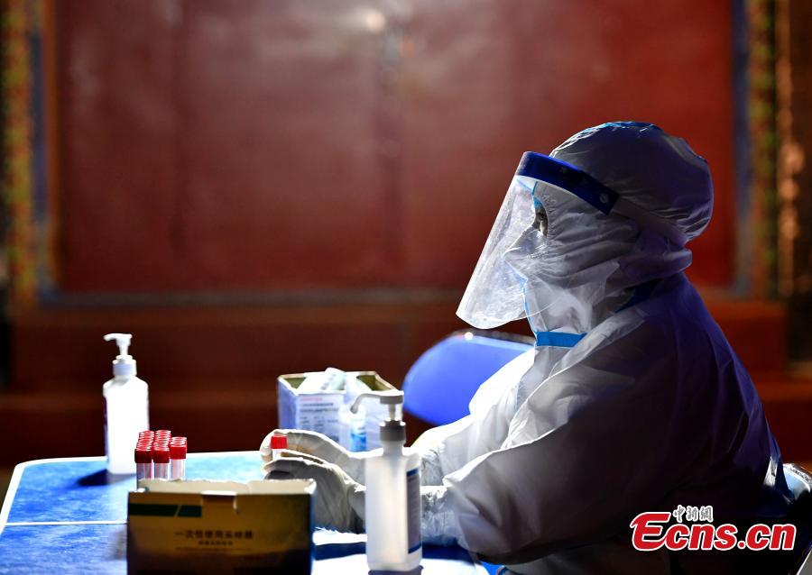 A medic works at a nucleic acid testing site in Lhasa, southwest China's Tibet Autonomous Region, Aug. 14, 2022. (Photo: China News Service/Li Lin)