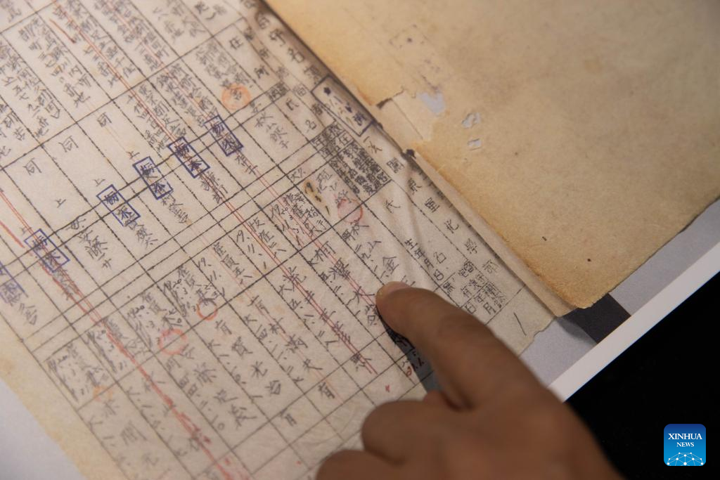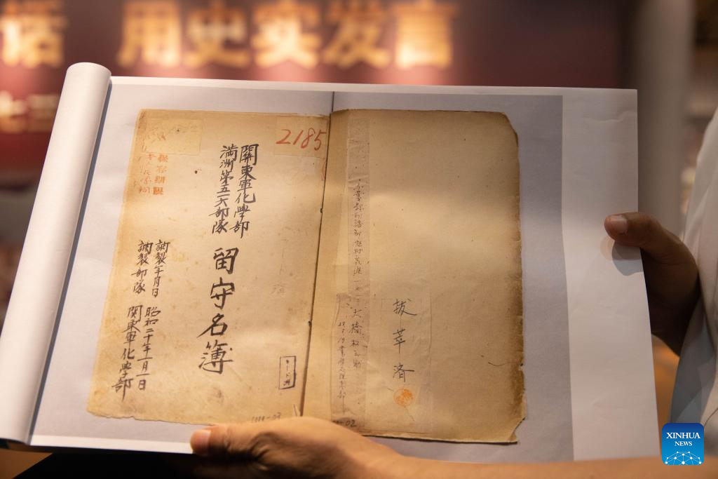 Photo taken on Aug. 13, 2022 shows a roll of a Japanese chemical warfare unit revealed by the Exhibition Hall of Evidences of Crime Committed by Unit 731 of the Japanese Imperial Army in Harbin, capital city of northeast China's Heilongjiang Province. The document contains the real names and personal information of 414 members of Unit 516, which was set up by the Japanese army in May 1939 in Qiqihar City of Heilongjiang Province, according to the exhibition hall. (Xinhua/Zhang Tao)