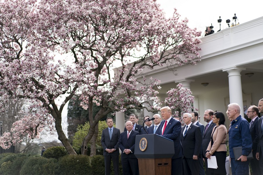 Photo taken on March 13, 2020 shows U.S. President Donald Trump (Front) addressing a news conference at the White House in Washington, D.C., the United States. (Xinhua/Liu Jie)