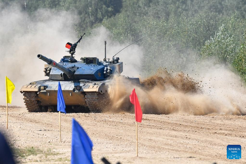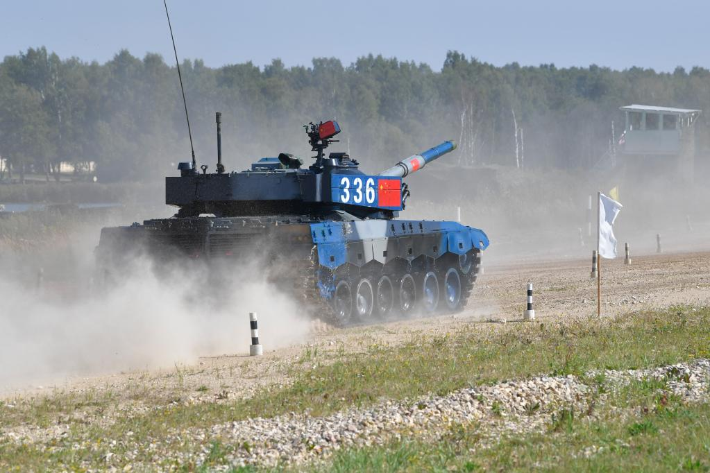A total of 21 countries and regions participate in the tank biathlon this year. The Chinese team uses 96B-type tanks, and the other teams use T-72 tanks. (Photo by Alexander Zemlianichenko Jr/Xinhua)