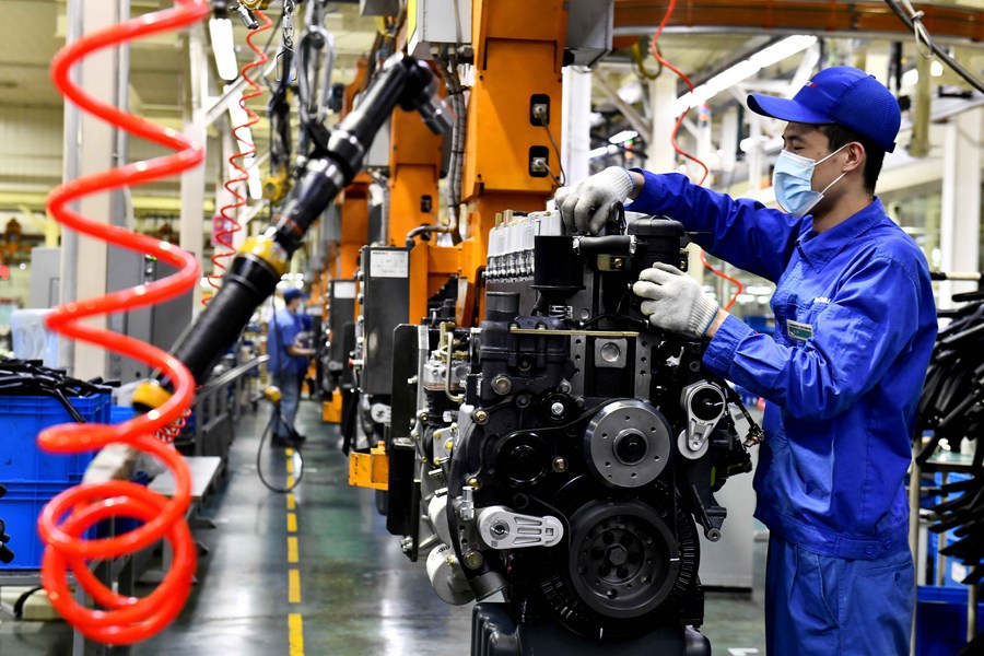 Workers assemble engines on an assembly line at a workshop of the Weichai Group in Weifang City, east China's Shandong Province, April 22, 2021. Weichai Power Co., Ltd., a state-owned enterprise, has developed China's first high-speed and high-power engine with completely independent intellectual property rights after more than 10 years of scientific and technological research. (Xinhua/Guo Xulei)