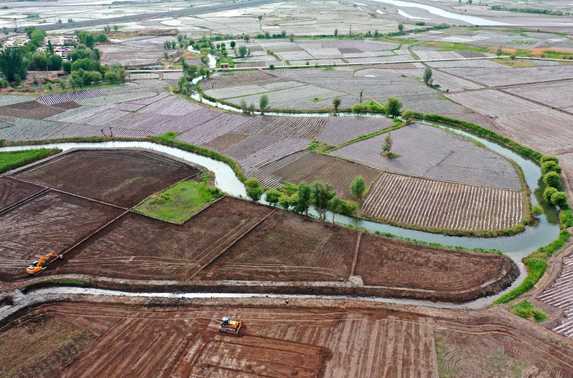 Excavators are leveling farmland in Wujiang township. Ganzhou district, Zhangye, northwest China's Gansu province, May 14, 2021. Ganzhou district has vigorously promoted the construction of high-standard farmland to optimize rural ecology. By providing farmers with water-saving irrigation technologies, farming machines and logistics support, the district has prominently improved the production efficiency of the agricultural sector. (People's Daily Online/Yang Yongwei)