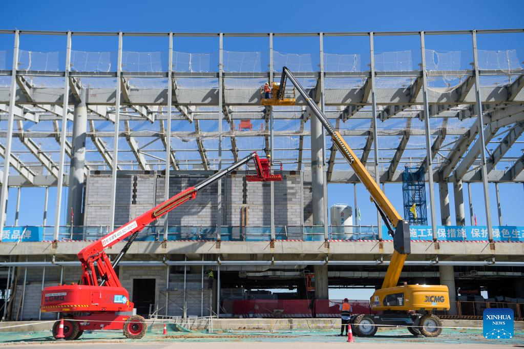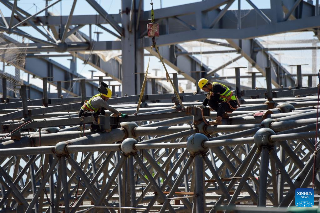 Laborers work at the construction site of a new airport in Hohhot, north China's Inner Mongolia Autonomous Region, Aug. 15, 2022. The main structure of the terminal of a new airport in Hohhot has been completed. (Xinhua/Li Zhipeng)
