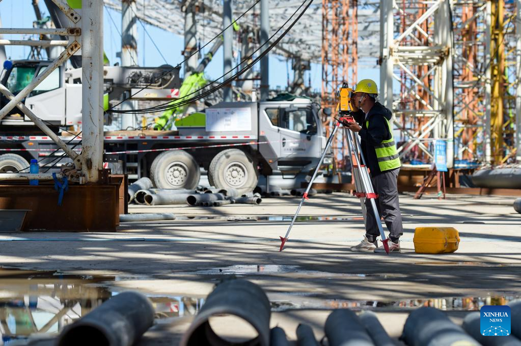A laborer works at the construction site of a new airport in Hohhot, north China's Inner Mongolia Autonomous Region, Aug. 15, 2022. The main structure of the terminal of a new airport in Hohhot has been completed. (Xinhua/Li Zhipeng)