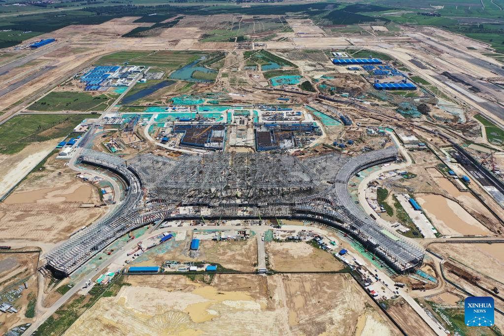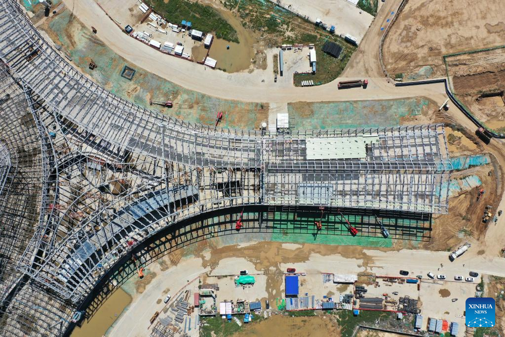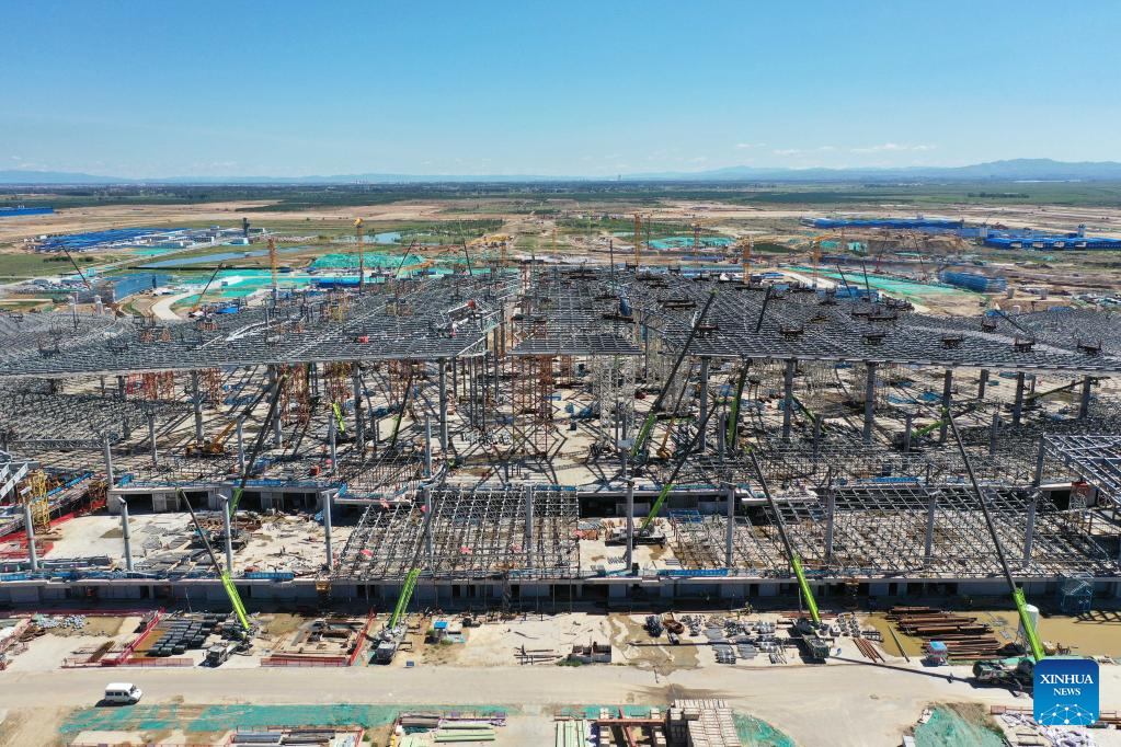 Photo taken on Aug. 15, 2022 shows the construction site of a new airport in Hohhot, north China's Inner Mongolia Autonomous Region. The main structure of the terminal of a new airport in Hohhot has been completed. (Xinhua/Li Zhipeng)