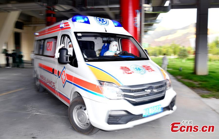 Recovered patients leave the makeshift hospital in an ambulance in Lhasa, southwest China's Tibet Autonomous Region, Aug. 15, 2022. (Photo: China News Service/Li Lin)