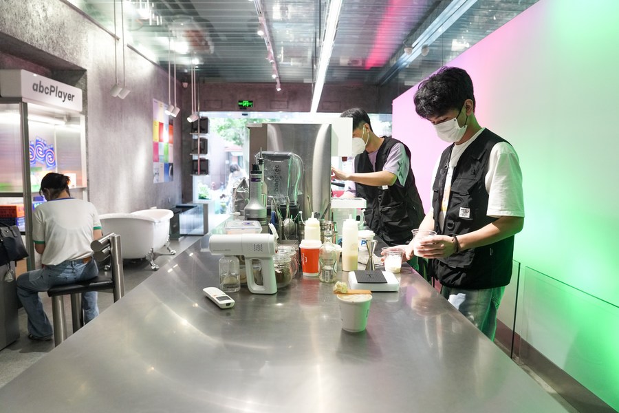 Baristas prepare coffee at a cafe in east China's Shanghai, June 29, 2022. (Xinhua/Ding Ting)