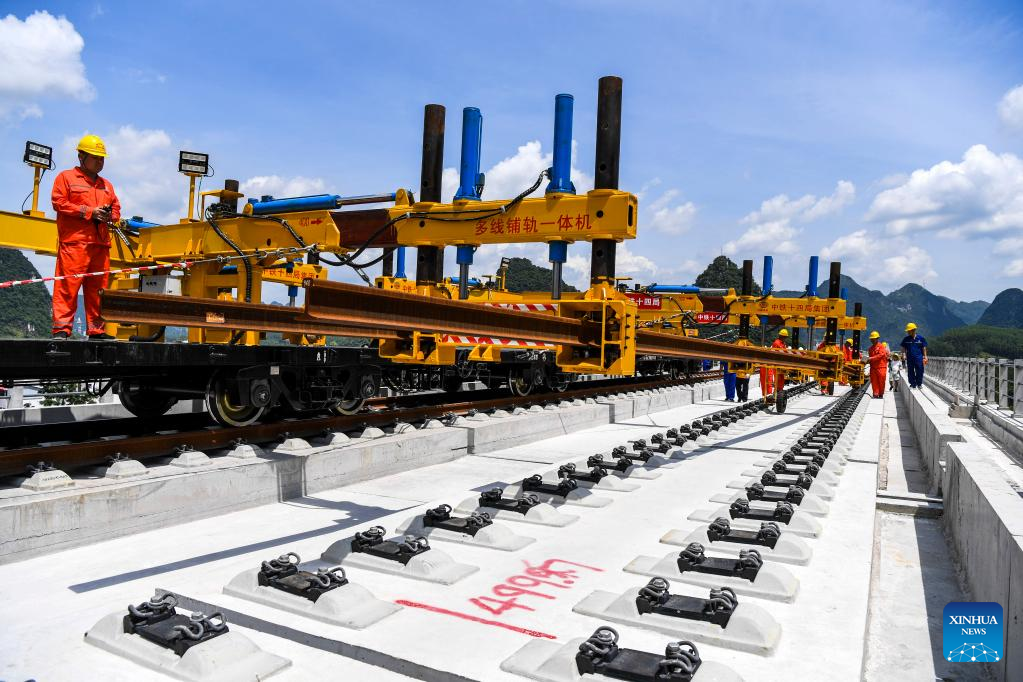 Photo taken on Aug. 16, 2022 shows the track laying work on the Longjiang River grand bridge of the Guiyang-Nanning high-speed railway (Guangxi section) in Hechi, south China's Guangxi Zhuang Autonomous Region. The railway track laying work of the Guiyang-Nanning high-speed railway, designed with a speed of 350 km per hour, began in Hechi of Guangxi on Tuesday. (Xinhua/Cao Yiming)