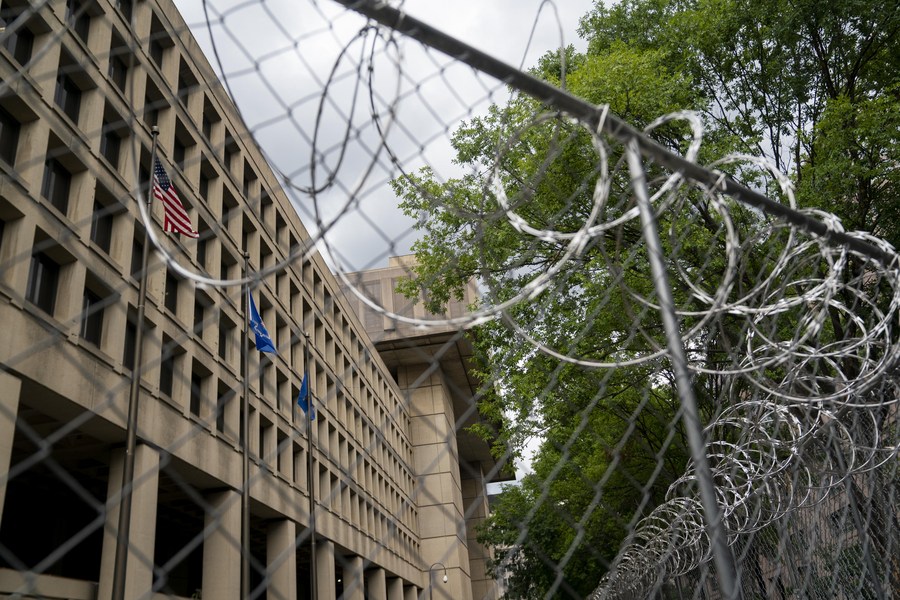 Photo taken on Aug. 15, 2022 shows the Federal Bureau of Investigation (FBI) headquarters behind security fencing in Washington, D.C., the United States. (Xinhua/Liu Jie)