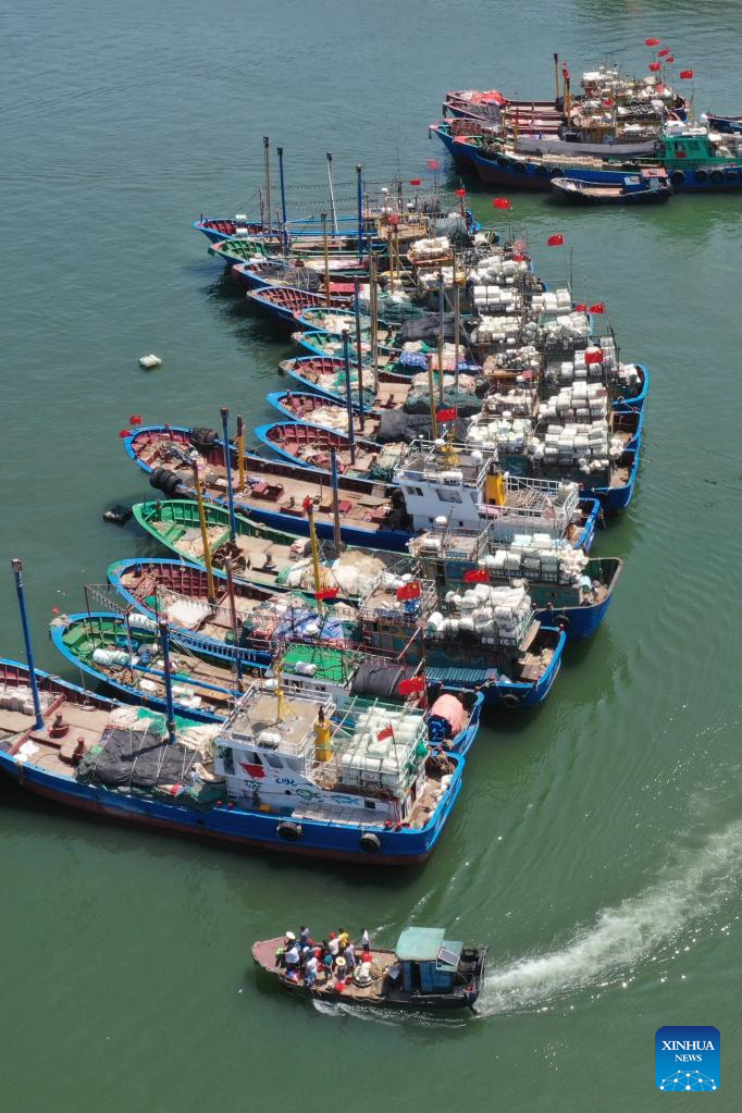 Aerial photo taken on Aug. 16, 2022 shows fishing boats getting ready for sailing at the Tailu fishing port in Lianjiang County of Fuzhou, southeast China's Fujian Province. Local fishermen began their fishing work as a three-and-a-half-month seasonal fishing ban was lifted at some sea areas in Fujian on Tuesday. (Xinhua/Jiang Kehong)
