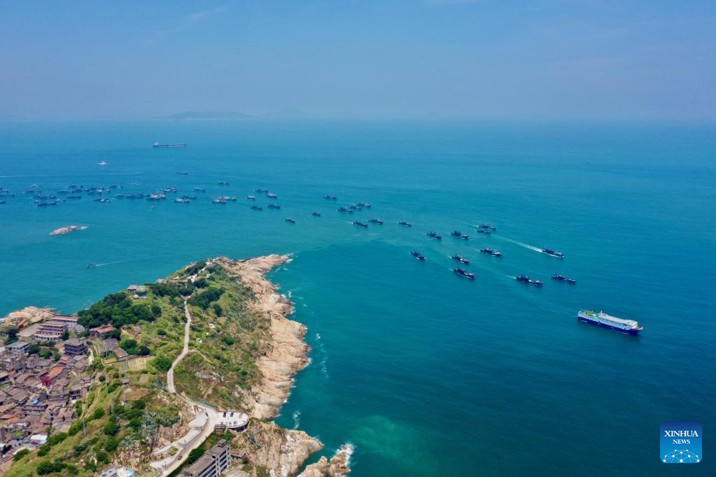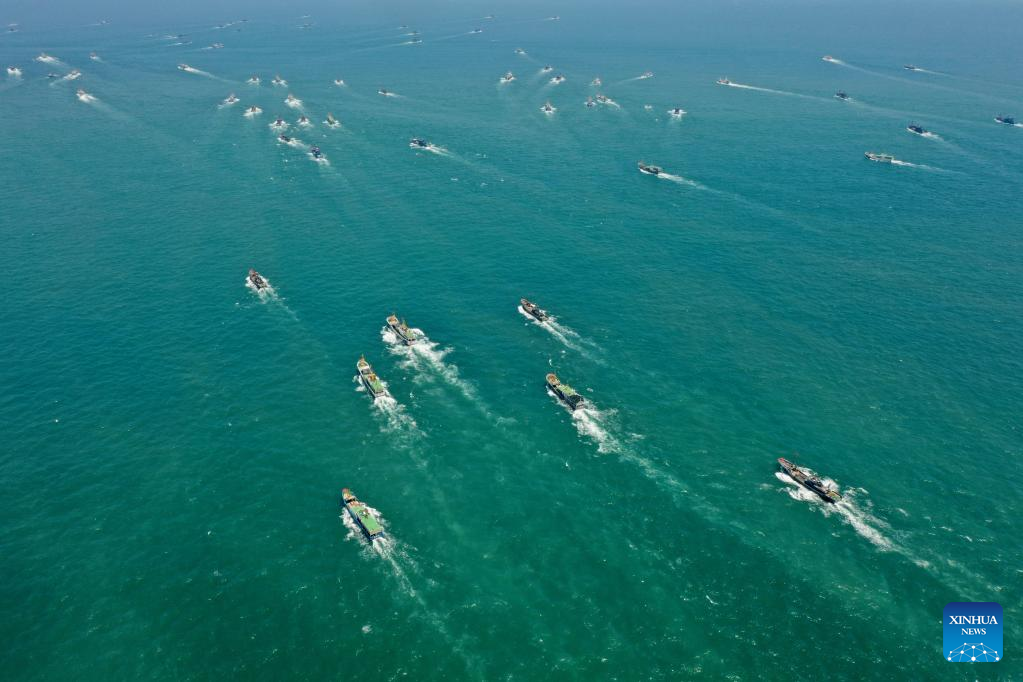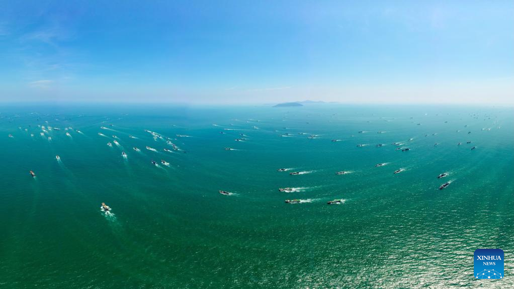 Aerial photo taken on Aug. 16, 2022 shows fishing boats sailing from Huangqi and Tailu fishing ports in Lianjiang County of Fuzhou, southeast China's Fujian Province. Local fishermen began their fishing work as a three-and-a-half-month seasonal fishing ban was lifted at some sea areas in Fujian on Tuesday. (Xinhua/Jiang Kehong)
