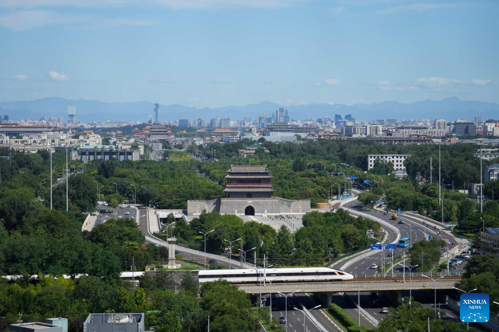 A bullet train passes by the Yongdingmen (Gate of Perpetual Peace) in Beijing, capital of China, Aug. 16, 2022. (Xinhua/Ju Huanzong)