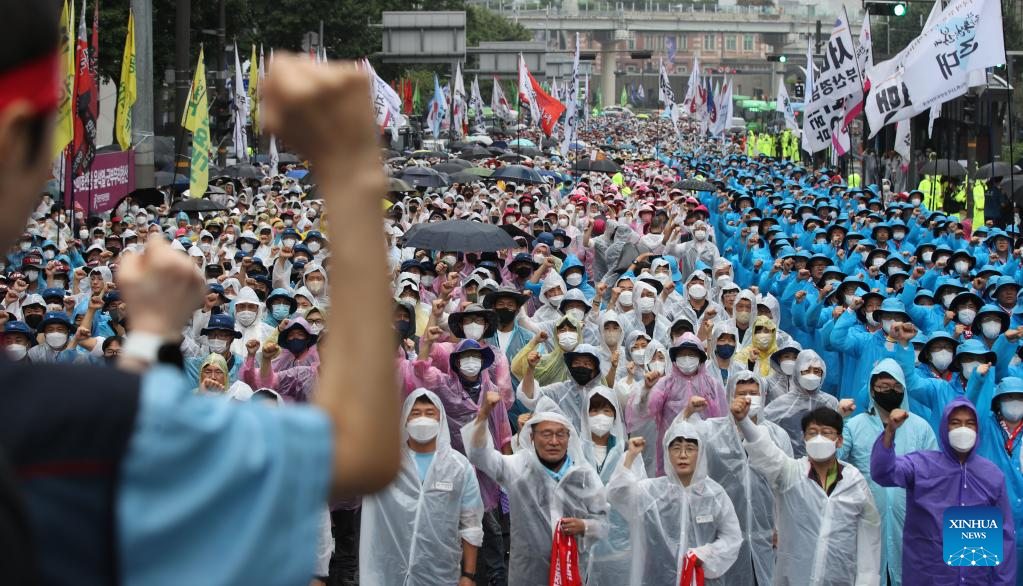 People rally to protest against the planned South Korea-U.S. military drills in Seoul, South Korea, Aug. 13, 2022. The combined forces of South Korea and the United States on Tuesday launched annual military drills as planned, three days after liberal activists held a massive rally to protest against it.