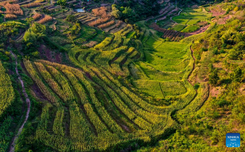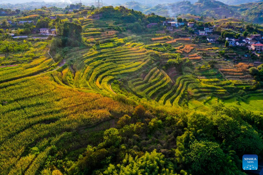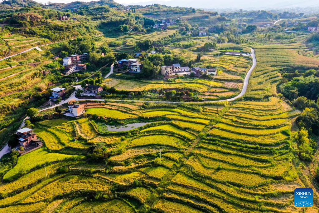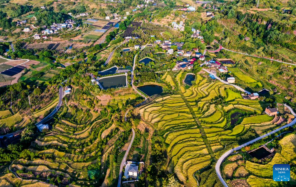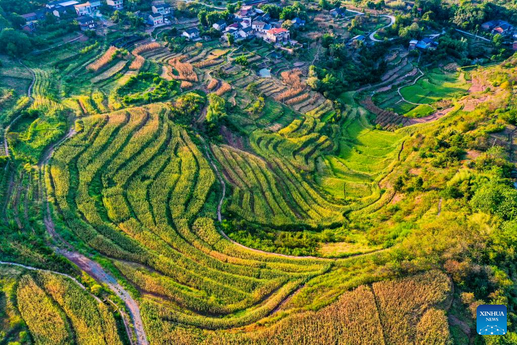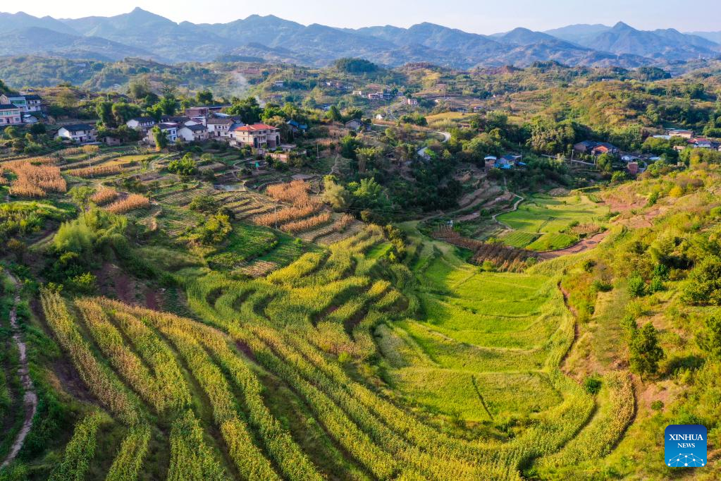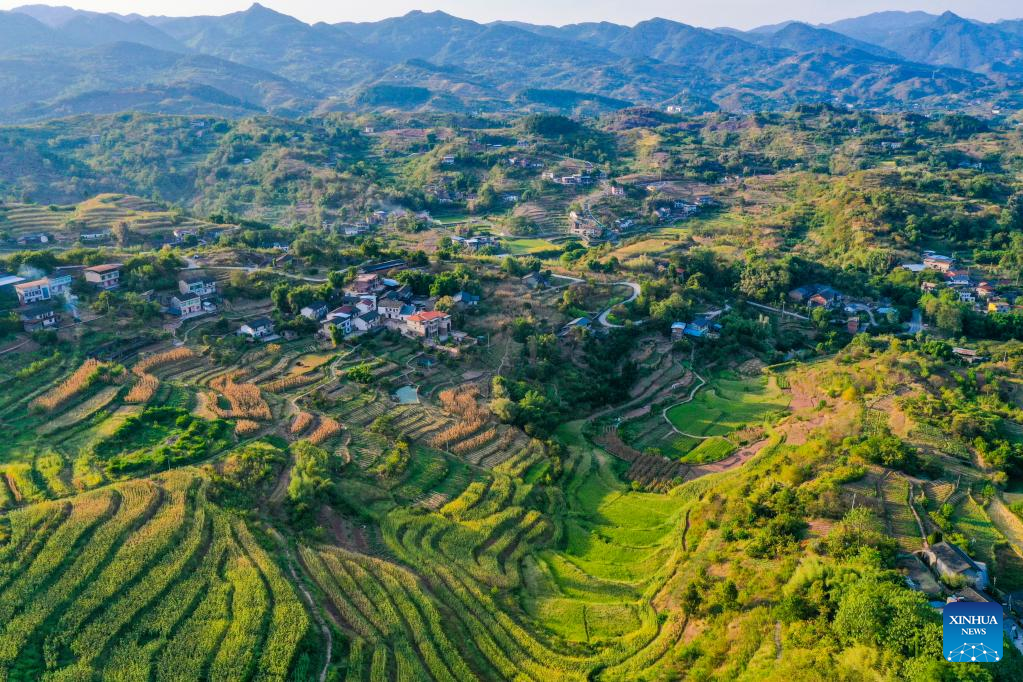 Aerial photo taken on Aug. 16, 2022 shows the scenery of Shiping Village of Sansheng Town, Beibei District, southwest China's Chongqing. (Xinhua/Wang Quanchao)
