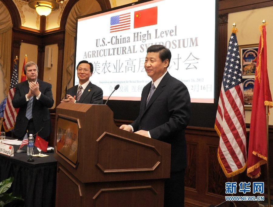 Then Chinese Vice President Xi Jinping delivers a speech at the China-U.S. High-Level Agricultural Symposium in Iowa during a visit to the U.S., Feb. 16, 2012. (Photo/Liu Jiansheng)