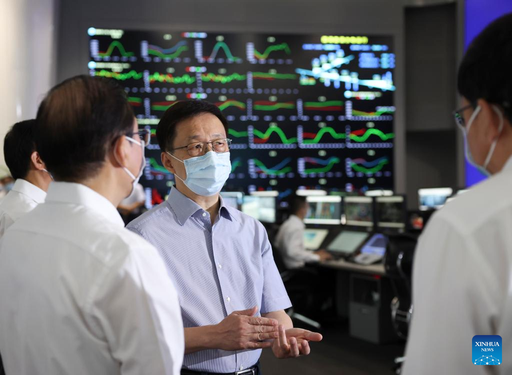 Chinese Vice Premier Han Zheng, also a member of the Standing Committee of the Political Bureau of the Communist Party of China Central Committee, visits the National Electric Power Dispatching and Control Center before a symposium at the State Grid Corporation of China, Aug. 17, 2022. Han made an inspection visit to the State Grid Corporation of China and presided over a symposium on Wednesday. (Xinhua/Ding Lin)