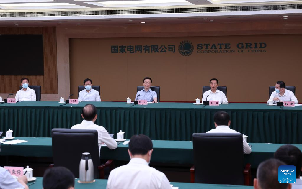 Chinese Vice Premier Han Zheng, also a member of the Standing Committee of the Political Bureau of the Communist Party of China Central Committee, presides over a symposium during an inspection visit to the State Grid Corporation of China, Aug. 17, 2022. (Xinhua/Ding Lin)