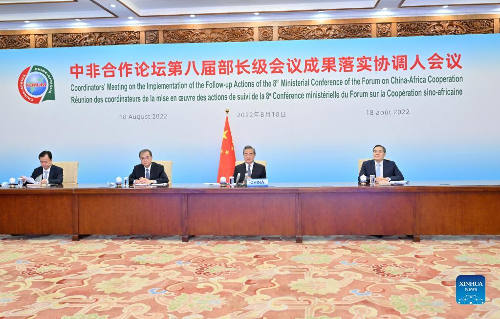 Chinese State Councilor and Foreign Minister Wang Yi chairs the coordinators' meeting on the implementation of the follow-up actions of the 8th Ministerial Conference of the Forum on China-Africa Cooperation (FOCAC) held in virtual format in Beijing, capital of China, Aug. 18, 2022. (Xinhua/Yue Yuewei)