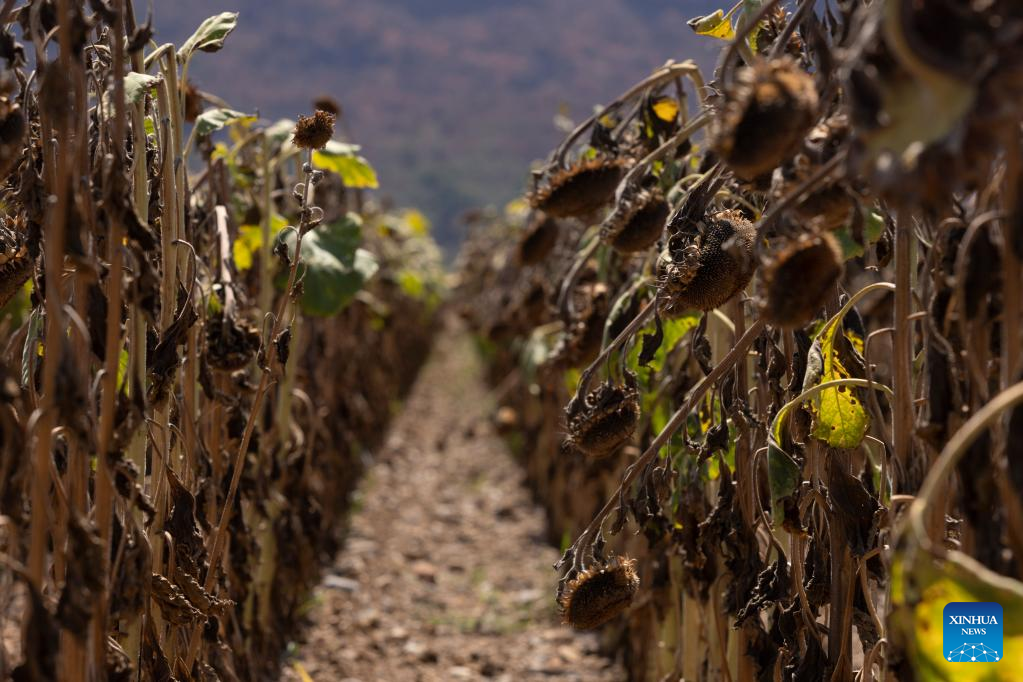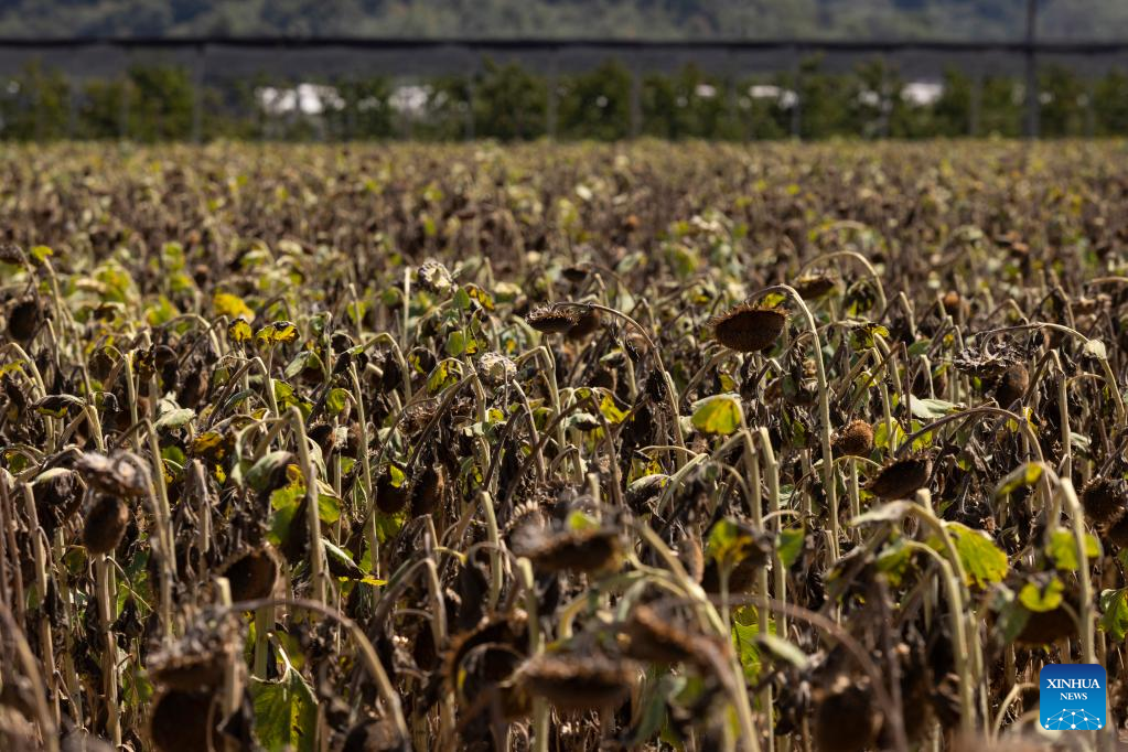 Withered sunflowers are seen in Karst, Nova Gorica, Slovenia, Aug. 16, 2022. Slovenia has faced persistent drought, especially in Vipava valley and the Karst region. (Photo by Zeljko Stevanic/Xinhua)