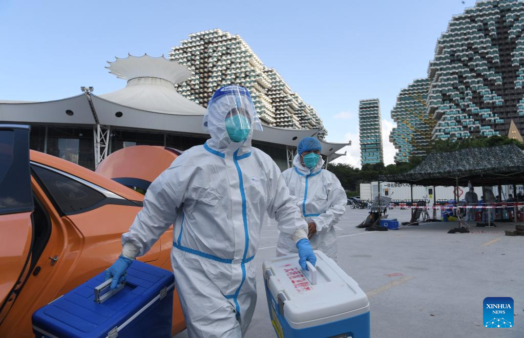 Volunteers transport nucleic acid samples in Sanya, south China's Hainan Province, Aug. 14, 2022. Sanya has optimized the processes of nucleic acid testing amid the latest COVID-19 resurgence. (Xinhua/Zhao Yingquan)
