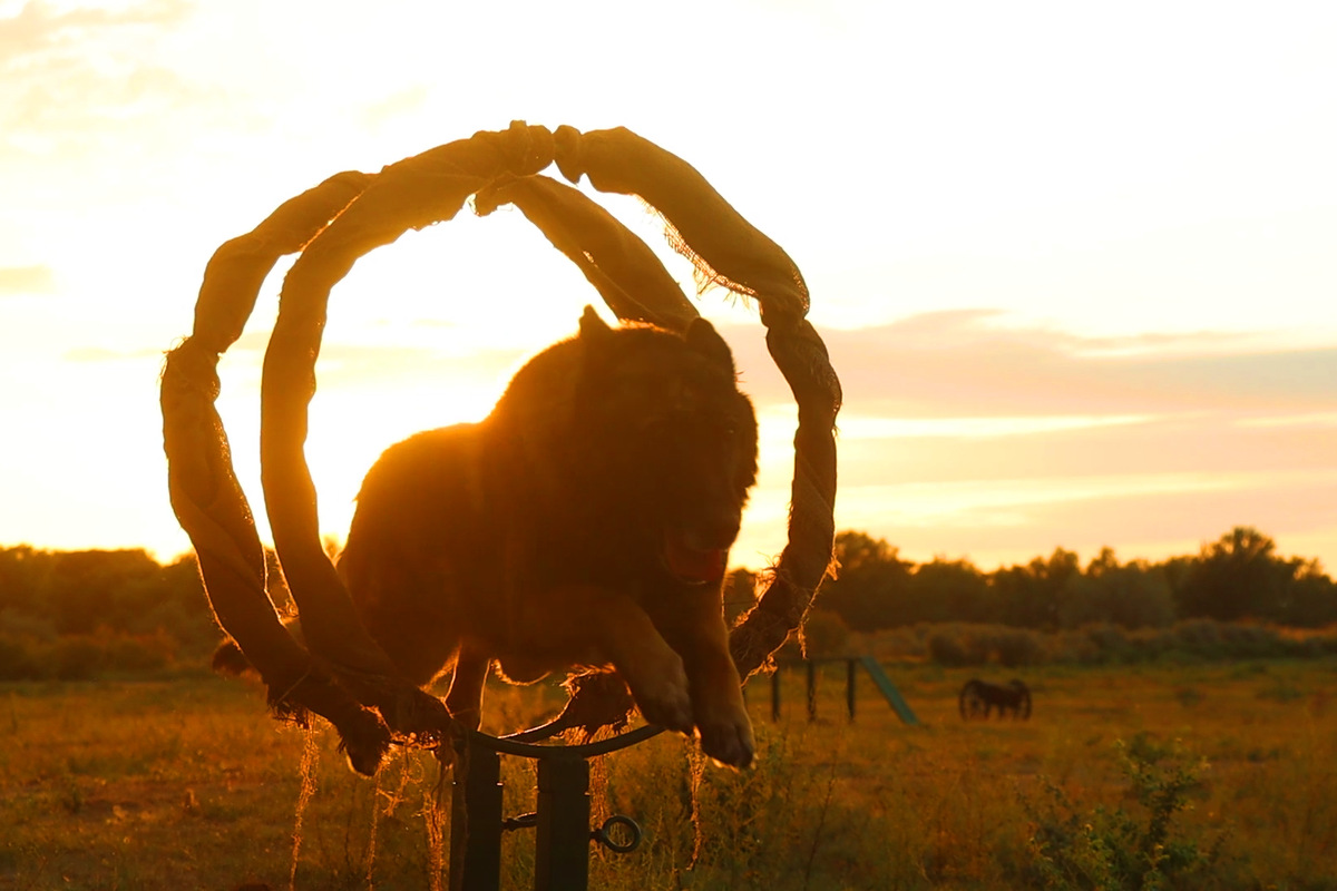 A photo shows Yanlong, a military dog, jumping through two training hoops in Altay prefecture in the Xinjiang Uygur autonomous region. [Photo provided to chinadaily.com.cn]