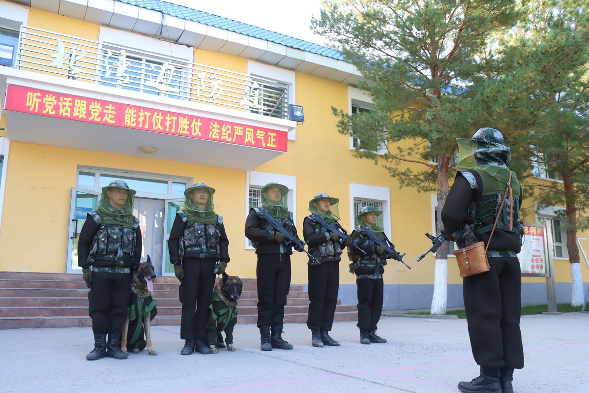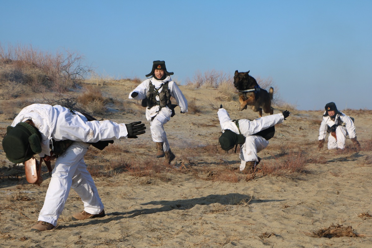 A photo shows border soldiers and military dogs getting ready for a patrol mission in Altay prefecture in the Xinjiang Uygur autonomous region. [Photo provided to chinadaily.com.cn]