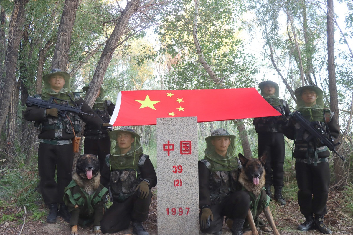 Border soldiers and military dogs take a photo together at a China and Kazakhstan border marker in Altay prefecture in the Xinjiang Uygur autonomous region. [Photo provided to chinadaily.com.cn]