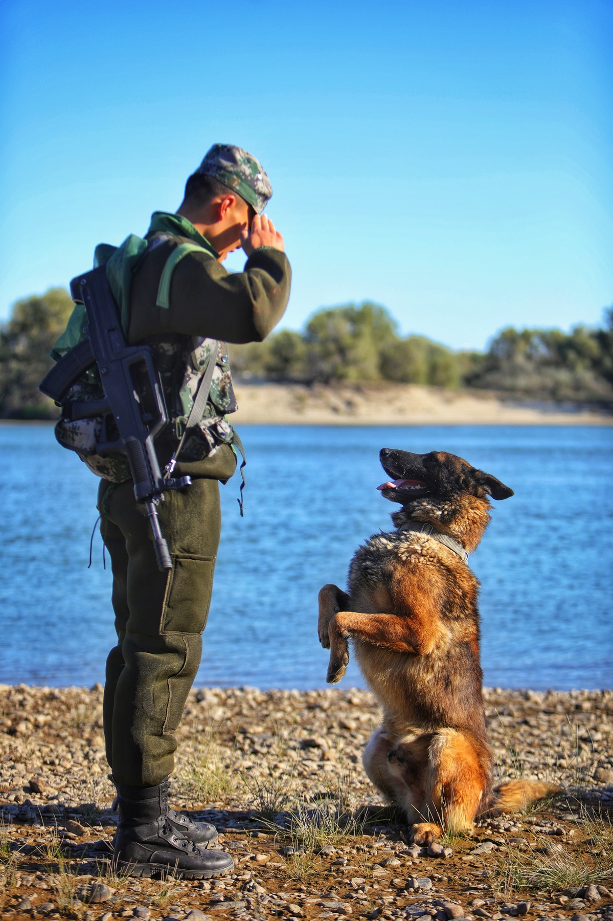 A photo shows Yanlong, a military dog, enjoying a lakeside view with its handler in Altay prefecture in the Xinjiang Uygur autonomous region. [Photo provided to chinadaily.com.cn]