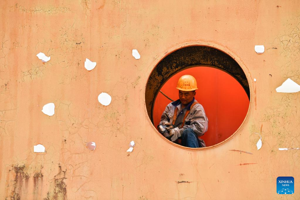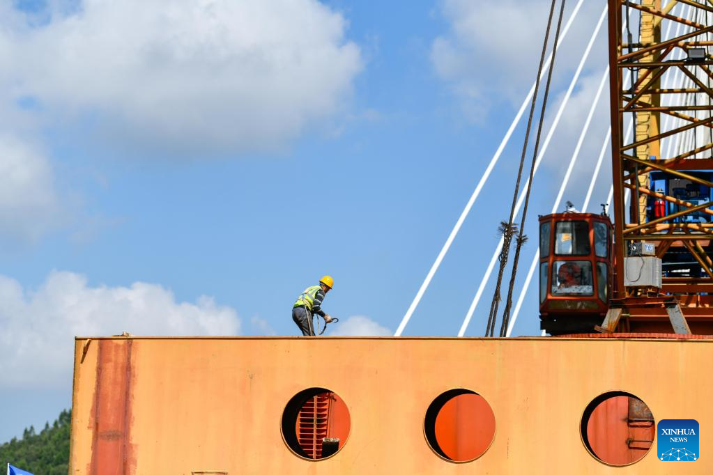 A constructor works at the construction site of the Longli River bridge in Longli County, southwest China's Guizhou Province, Aug. 19, 2022. The 1,260-meter-long bridge was joined together on Friday. (Xinhua/Yang Wenbin)