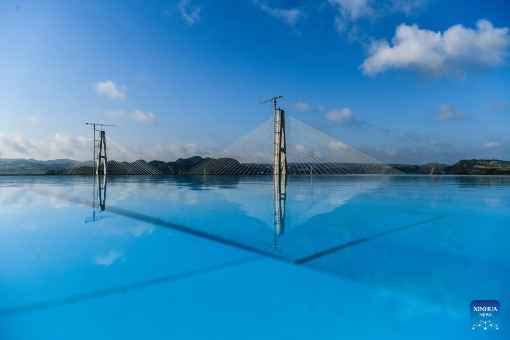 The construction site of the Longli River bridge is reflected in a pool of a hotel in Longli County, southwest China's Guizhou Province, Aug. 19, 2022. The 1,260-meter-long bridge was joined together on Friday. (Xinhua/Yang Wenbin)