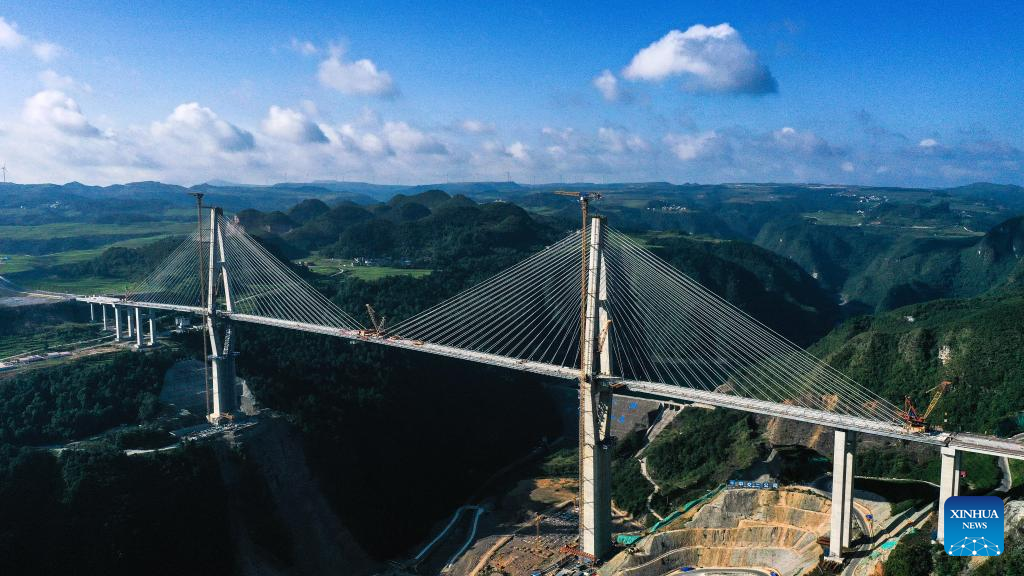 Photo taken on Aug. 19, 2022 shows the construction site of the Longli River bridge in Longli County, southwest China's Guizhou Province. The 1,260-meter-long bridge was joined together on Friday. (Xinhua/Yang Wenbin)