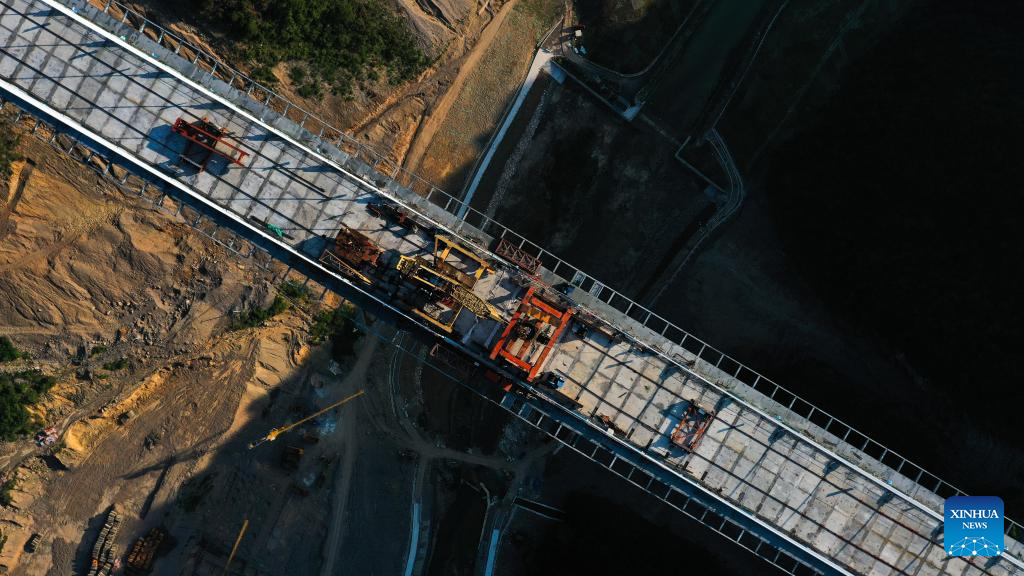 Constructors work at the construction site of the Longli River bridge in Longli County, southwest China's Guizhou Province, Aug. 19, 2022. The 1,260-meter-long bridge was joined together on Friday. (Xinhua/Yang Wenbin)