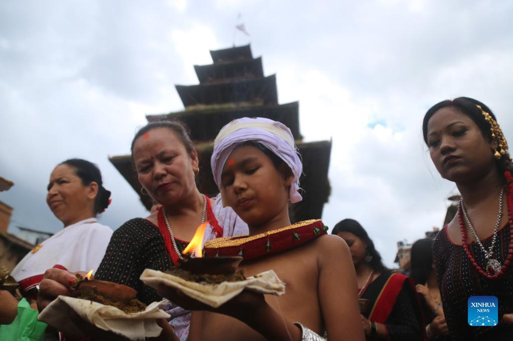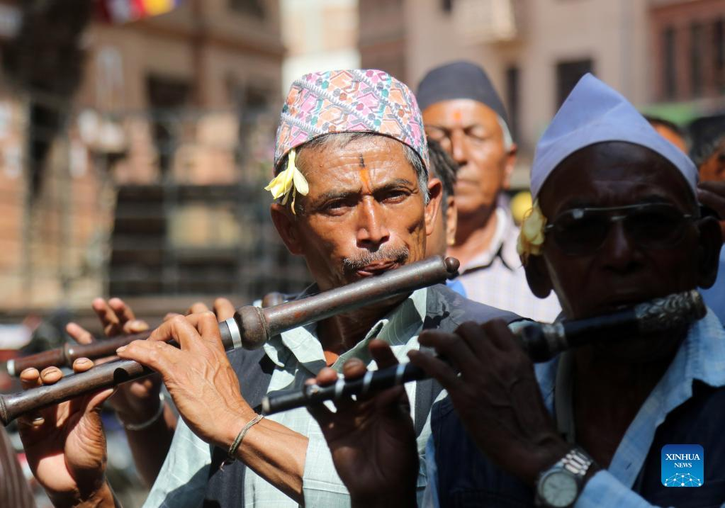 People take part in a parade during the Krishna Janmashtami festival in Bhaktapur, Nepal, Aug. 19, 2022. Krishna Janmashtami festival is celebrated annually to mark the birth anniversary of Hindu God Krishna. (Photo by Sulav Shrestha/Xinhua)